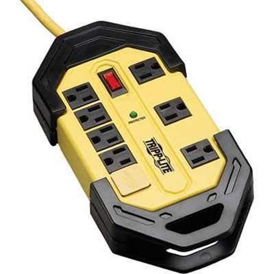 This Tripp Lite surge suppressor is designed to provide safe, reliable surge protection in harsh environments. A high 1500 joule rating can protect connected equipment against even the strongest surges. 8 outlets protect connected equipment against damaging surges, spikes and line noise. Convenient transformer outlets accommodate multiple transformers without blocking other outlets. A 12 ft. grounded cord with integrated cord clip reaches distant outlets. A lighted on/off switch with integrated circuit breaker provides power control over connected equipment. Breaker protects against dangerous system overload. Protected LED confirms that connected equipment is being protected. 4 safety covers shield unused outlets from debris and accidental contact. A rugged metal case stands up to the harshest environments. Built-in cord wrap with hang holes provides convenient cord management. Integrated keyhole slots on bottom panel provide convenient wall/desk mounting. Tripp Lite will repair or replace any connected equipment damaged by surges, including direct lightning strikes, up to $50,000 and for life! As an added safety feature, the surge suppressor's bright yellow color alerts you and others that power cords and tools are in use.