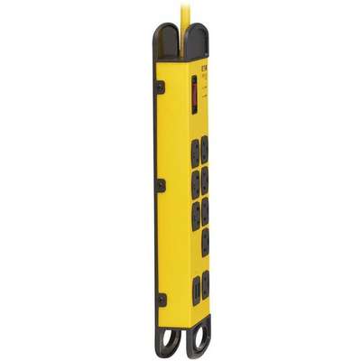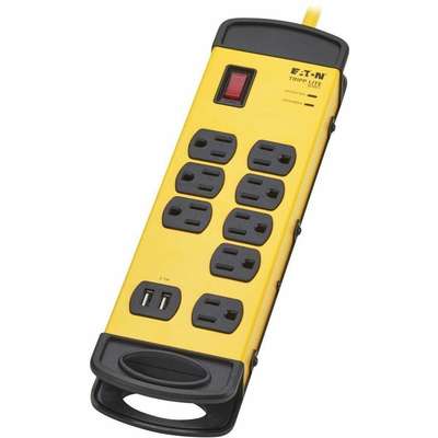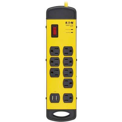 Features | Industrial-Grade Surge Protector with USB Charging Safeguards Your Sensitive Electronics Ideal for your factory floors, basements, garages, warehouses, automotive plants and other industrial facilities, this Protect It!® safety surge protector features a surge suppression rating of 1960 joules to defend your sensitive components against power surges and spikes. Because residential power outlets have three wires-hot line (H), neutral (N) and ground (G)-the TLM825USB protects all three, covering the two protection modes: full normal mode (H-N) and common mode (N-G/H-G). NEMA 5-15R Outlets Accept a Wide Range of Electronic Devices Plug your air compressor, power tools, work lights, pumps and other electronics into eight NEMA 5-15R outlets to protect them against dangerous surges, spikes and line noise. One outlet is separated from the others to allow connection of bulky transformers without blocking adjacent outlets. Four safety covers are included to shield unused outlets from dust and other debris. 2 USB Ports Share 2.1 Amps of Charging Power This surge protector with two USB-A ports is ideal for keeping your devices at full capacity. The USB ports are available for charging your smartphone, tablet and other mobile devices. Filtering EMI/RFI Line Noise Helps Your Equipment Perform Better The TLM825USB filters out disruptive electromagnetic and radio frequency interference that can inflict hardware damage or data loss. This EMI/RFI filtering also helps your connected components perform better and last longer. Includes the Latest Safety Features The lighted on/off switch with integrated circuit breaker provides one-touch control over connected equipment. LEDs let you know when your connected devices are properly protected and grounded. Automatic shutoff permanently cuts power to outlets if protection circuit is incapacitated, preventing equipment damage and indicating replacement is required. The TLM825USB also complies with OSHA color guidelines that alert you to hazardous conditions that may cause minor or moderate injury. Versatile Surge Protector Provides Multiple Installation Options This industrial-grade surge protector with 25-foot AC input cord and NEMA 5-15P plug gives you flexibility in placing the unit away from the nearest wall outlet. Keyhole slots integrated into the bottom panel provide convenient wall or desk mounting options for the yellow metal housing. A cord wrap with hang holes lets you store the TLM825USB conveniently out of the way when not in use. |